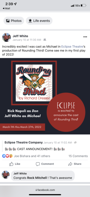 Congratulations to Jeff White for being cast as "Michael" in Eclipse Theatre's production of "Rounding Third."